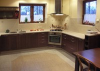 Zachowane proste formy nowoczesnej kuchni połączone z delikatnym wzorem frontów drewnianych dają nieodparte wrażenie zachowania przestrzeni. Blat z płyty SSV. tworzy jednorodną całość jakby jego formę wycięto z kamienia. Należy zwrócić jeszcze uwagę na zamontowanie zlewu -jest to o tyle istotne że ułatwia nam to w znacznym stopniu utrzymanie czystości na blacie i wokół zlewu. Wszystkie nieczystości zgarniamy bezpośrednio z blatu do zlewu gdzie w przypadku zastosowania zlewu nakładanego przeszkadza nam w tej czynności jego rant.