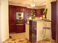 Ciepła, domowa kuchnia w klasycznym stylu. Fronty z drewna czereśni oraz nawiązujący do ich naturalnej barwy, blat. Listwa wieńcząca nad szafkami oraz witraż dopełniają całość nadając kuchni ciepła i oryginalności.