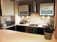 Nowoczesna kuchnia z elementami klasyki. Fronty w kolorze wenge połączone z lakierowaną w połysku jasną górą. Biały blat kontrastuje z ciemnym dołem nawiązując zarazem do waniliowych frontów szafek górnych..