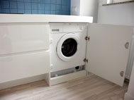 Kuchnia w ciepłej bieli jeszcze bardziej potęguje wrażenie przestrzenności.
